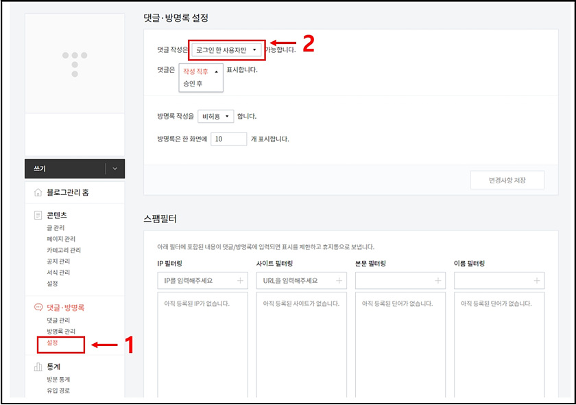 다음은 스팸 계정들의 무분별한 댓글 게릴라 차단을 위한 설정입니다. 위 사진의 댓글 방명록 하위 카테고리의 [설정]탭에서 댓글 작성은 [로그인 한 사용자만]으로 바꾸어 주셔야 합니다. 아래 쪽에 댓글은 [승인후]로 표시합니다로 바꾸어 주시면 승인된 댓글만 노출이 되므로 블로그를 깨끗하게 유지하는 데에 도움이 됩니다. 방명록 운영 여부는 취향 대로 선택해 주세요.